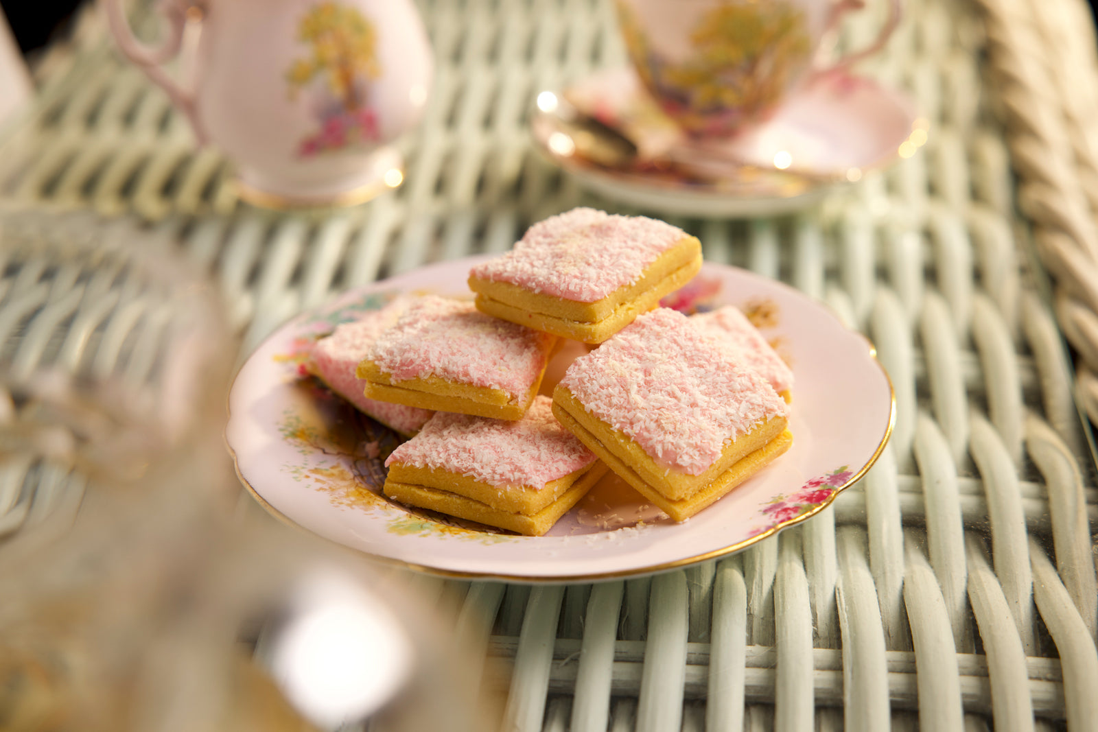 The trustworthy and reliable Rolling Pin. Rolled and cut into Squares, sandwiched together with a sweet jam centre and crowned on top with a Pink Rose Icing and Coconut finish.
